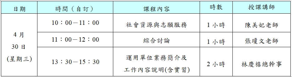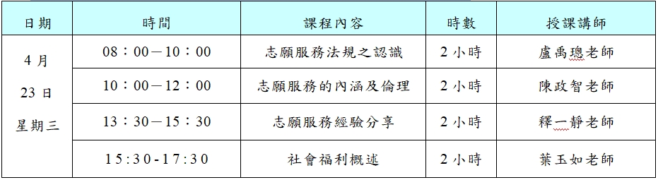 (二)社會福利類志工特殊教育課程:114430(星期三)
